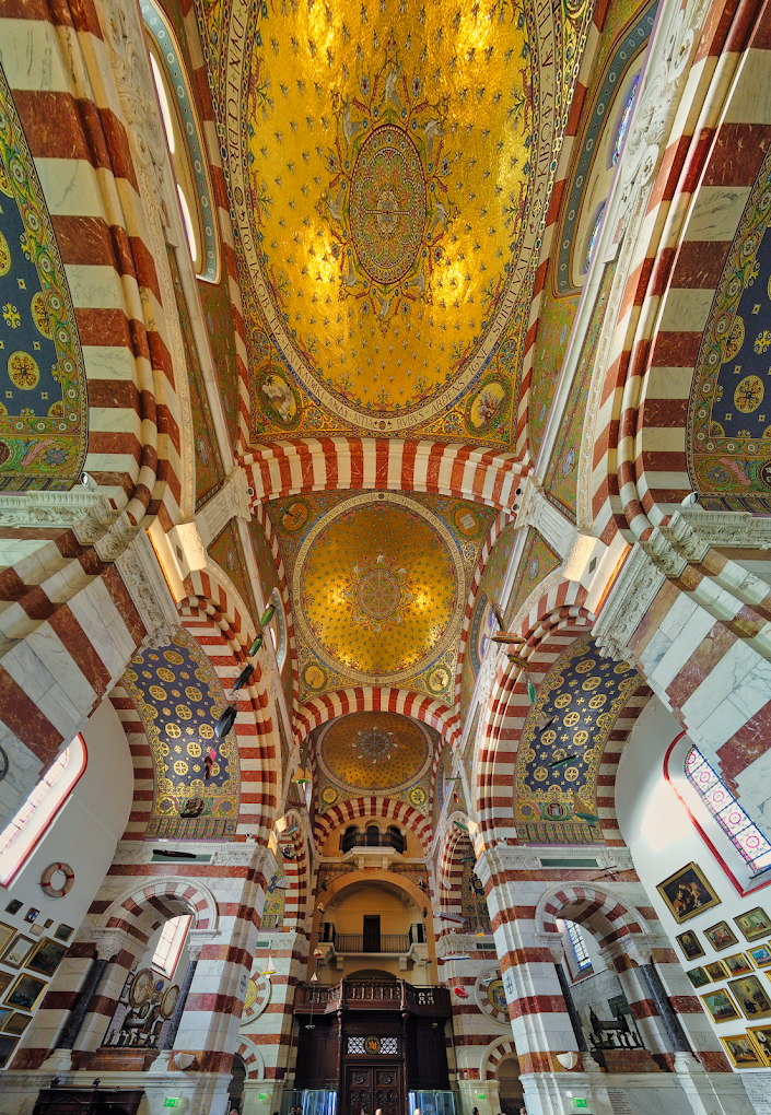 Built in the 19th century (completed in 1864), Notre-Dame de la Garde stands on the site of a former medieval chapel. The basilica is designed in a Neo-Byzantine style, combining Romanesque and Byzantine influences. Its exterior is made of alternating layers of white limestone and green sandstone, giving it a unique and striking appearance.