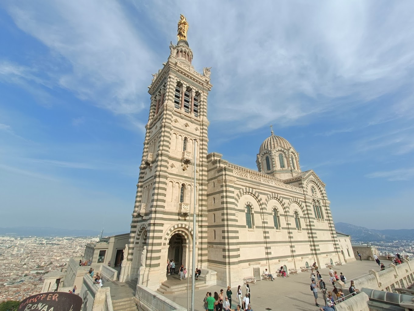 At the top of the bell tower stands the famous golden statue of the Virgin Mary and Child, measuring over 11 meters high. The statue is visible from almost anywhere in Marseille and serves as a symbol of protection for sailors, fishermen, and the city itself.